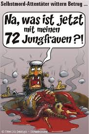 Dazu die Vertretung der Jungfrauen: "Kamen früher junge Männer in Bombenstimmung an die Pforte des Paradieses, so tauchen heute immer häufiger zerfetzte und zerlumpten Gestalten mit fehlenden Gliedmaßen und deutlichem Humordefizit auf. Die will natürlich keine versprochene Jungfrau mehr."